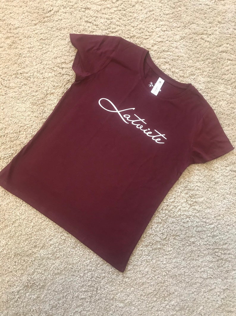 Sieviešu t-krekls – Latviete! Kokvilnas bordo krāsas t-krekls ar baltu apdruku.